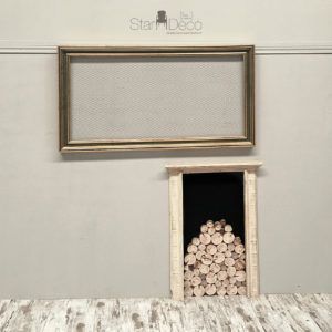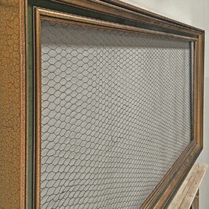 Se le ha incorporado una malla metálica efecto óxido de cobre para colocación de tarjetas, fotos o cualquier otra decoración.